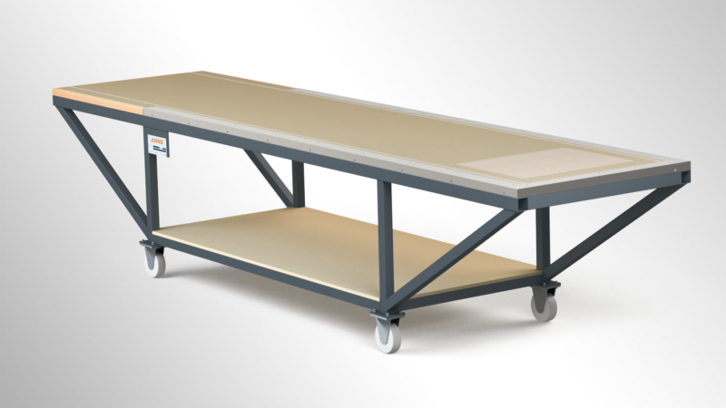 Zum Zuschneiden, Bereitstellen, Zwischenlagern und Verpacken. Ausstattung: stabiler Unterbau, Phenolspanplatte, Anschlag und seitliches Massband; fahrbar und mit Bremsen versehen; lieferbar: 4, 6 und 8 m lang, 1000 und 1250 mm breit.